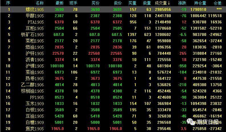 从图中可以看出,昨日国内期货主力合约成交过百万(双边)的仅有螺纹钢、甲醇、PTA等五个品种,成交量超过50万的主力合约仅有13个品种。 昨日,更多的上市主力合约成交量则不足20万手(双边):