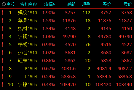 | 午后商品期货跌多涨少,黑色系震荡上行,螺纹涨近2%,热卷涨逾1%,铁矿石收涨,双焦偏弱,焦煤跌近2%;有色金属分化,沪铜涨逾1%,沪镍、铅飘红,沪铝、锡微跌,沪锌跌逾1%;化工品下行,PTA、沥青跌近2%,橡胶跌逾1%,燃油跌近%;农产品疲软,苹果创于四个月新高,涨逾1%,双粕下行,菜粕跌逾2%,白糖飘绿。 截止下午收盘,螺纹涨1.90%,苹果涨1.59%,沪铜涨1.06%,热卷涨1.02%;跌幅方面,菜粕跌2.16%,焦煤跌1.99%,PTA跌1.88%,沥青跌1.75%。