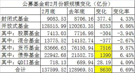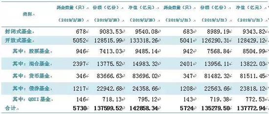 今天,中国证券投资基金业协会公布数据显示,截至2019年2月底,我国境内137家具有公募牌照的机构合计管理规模为14.29万亿元,自去年8月底站上14.08万亿关口后,时隔6个月再度刷新历史新高。 在今年股市行情回暖的市场环境下,随着持股市值的增长和资金的净申购,偏股基金前两月规模增速最快,货币型基金吸金规模最多,债券型基金总管理规模刷新历史新高,各主要类型基金的规模均出现全线净增长的态势。 偏股基金规模2.45万亿前两月增幅明显 从2月份数据来看,今年2月公募基金管理规模环比1月份增长5085.4亿元,其中货币基金增长2185亿元,是规模增长最多的基金类型;偏股基金管理规模增长也比较明显,混合型基金、股票型基金规模在2月份分别增长1161亿元、980亿元。 从今年前2个月数据看,公募基金今年以来规模猛增1.25万亿元,包含股基、混基、债基、货基、QDII基金在内的各类型基金皆出现规模的净增长势头。 从各类型基金增幅看,偏股基金成为今年前2个月规模增长最为迅猛的赢家。 从规模增量看,前两月偏股基金规模猛增2620亿元,区间涨幅为12%,偏股基金规模也从去年末2.18万亿的低点快速反弹至2.45万亿元。 其中,股基、混基、QDII基金的管理规模均出现两位数的增幅。今年前2月,股票型基金规模从去年末的8245亿增至9485亿,今年以来规模净增1240亿元,以15%的增幅位居各类型基金之首。同期,混合型基金规模也猛增1380亿元,增幅为10%。 业内人士表示,今年前两月股票市场快速反弹,上证综指区间涨幅接近18%,偏股类基金规模快速扩张,一方面是持股市值上涨带来的规模扩张,尤其是高仓位的股票型基金规模增速迅猛;另一方面,偏股基金赚钱效应凸显,也导致偏股基金受到资金净申购带来规模的快速扩张,新基金发行回暖也会带来一些规模的增量。 货基“吸金”最多 2个月规模猛增7500亿 不过,从公募管理规模的绝对增量看,货币基金仍然是前两个月“吸金”最多的产品类型。截至今年2月底,货币型基金2个月吸金7518亿元,总规模已经达到8.37万亿元,区间规模增幅也高达9.87%。 8.37万亿元的货基规模,再度接近去年8月底货基规模的历史高点,目前货基管理规模接近公募总管理规模的60%,仍旧是各类投资者最青睐的产品类型。 值得注意的是,延续近一年的债牛行情叠加机构投资者的青睐,债券型基金前2月规模也大增1730亿元,总管理规模达到2.44万亿元,再度刷新历史高点。 北京一位次新公募高管告诉记者,债券型基金仍旧是不少低风险的机构投资者青睐的产品,去年他所在公募在债牛行情中给机构持有人贡献了年化8%-12%的投资收益。 这位高管表示,虽然今年债市震荡加大,但机构资金仍旧看好下半年债市机会,今年机构纯债策略的产品规模仍旧增长较快,机构投资者对债券基金的认可以及公募对债券投资的专业管理优势,有可能带动债券型基金管理规模继续扩张。 表1:近一年公募基金产品数量和管理规模数据 责任编辑:刘文强 |