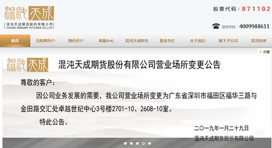| 近日,期货圈内传奇人物葛卫东大佬旗下的混沌天成期货股份有限公司可谓是调整不断。2018年年度报告显示,2018年全年混沌天成期货业绩暴亏,亏损高达180%。年后,混沌天成做出了一系列的调整措施,先是变更营业场所,紧接着又放弃私募牌照,这一波操作能否拯救水火中的混沌天成期货,是断尾求生还是饮鸩止渴? 变更营业场所 据官网显示,因业务发展需要,混沌天成期货股份有限公司的营业场所于今年1月29日发生变更。