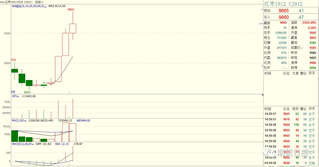 无独有偶,刚刚上市不久的红枣期货,近几个交易日的表现也很喜人。仅仅4个交易日,红枣期货主力1912合约从8620元/吨上涨至昨日收盘的9660元/吨,涨幅超过1000元/吨。昨日盘中更是一度大幅拉涨至9865元/吨,创出上市以来新高。
