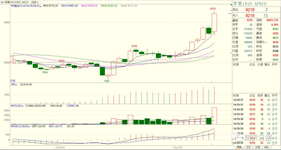 | 昨日,国内期货市场最为火热的品种莫过于苹果期货。截至收盘,苹果期货主力1910合约报9218元/吨,涨幅达5.13%,尾盘一度拉升至涨停板9295元/吨,并且量价齐升,成交量71.4万手,增加43.7万手,持仓量15.2万手,增加1.9万手。