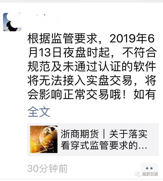 正如期货日报记者朋友圈各期货公司提示,北京时间今晚21:00还没有通过期货公司相关部门认证的各种外接交易软件将不能连接期货公司主席席位,届时投资者正常期货品种下单交易将会被期货公司交易系统拒绝(小编友情提示:还没有通过的投资者快快联系开户期货公司)。 中国证监会曾于2018年9月7日在其官网发布了2018年第27号公告——《关于进一步加强期货经营机构客户交易终端信息采集有关事项的公告》,明确了今晚即将执行的相关政策细节。