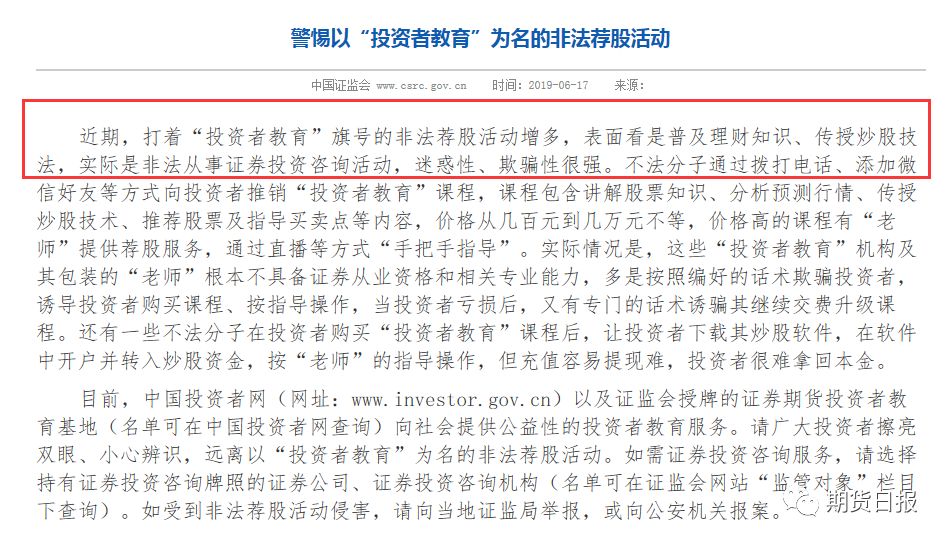 | 近期,非法证券期货投资咨询活动又披上“投资者教育”的新外衣进入了公众视野。 自今年以来,随着各类非法证券期货投资咨询活动的抬头,监管部门除了加强对金融乱象的整治之外,对投资者教育的力度也在持续加大。今年“315”时期,监管部门就强化投资者教育和教育部联合印发《关于加强证券期货知识普及教育的合作备忘录》,共同发力开展证券期货知识普及活动,加之行业各个主体合力宣传推动,全民学习金融知识的浪潮也越来越大。 然而,令人大跌眼镜的是,非法证券期货活动竟又借助投资者教育浪潮下又开始蠢蠢欲动。不得不说,从事非法证券期货投资咨询的非法分子也算的上积极追赶潮流,敢于明目张胆地借“政策东风”再一次坑害投资者。 为此,证监会近日发布发布警惕以“投资者教育”为名的非法荐股活动的公告,提示投资者近期有不法分子通过拨打电话、添加微信好友等方式向投资者推销“投资者教育”课程,而“投资者教育”机构及其包装的“老师”根本不具备证券从业资格和相关专业能力,希望广大投资者注意识别这类非法荐股活动。