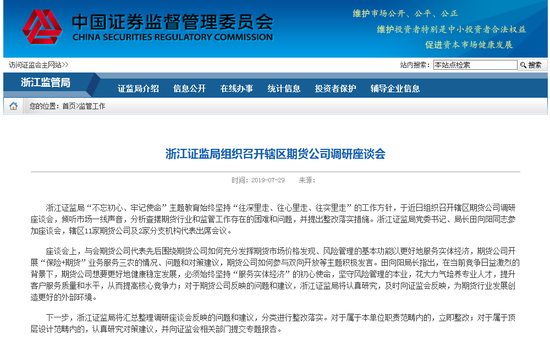 | 浙江证监局“不忘初心、牢记使命”主题教育始终坚持“往深里走、往心里走、往实里走”的工作方针,于近日组织召开辖区期货公司调研座谈会,倾听市场一线声音,分析查摆期货行业和监管工作存在的困难和问题,并提出整改落实措施。浙江证监局党委书记、局长田向阳同志参加座谈会,辖区11家期货公司及2家分支机构代表出席会议。 座谈会上,与会期货公司代表先后围绕期货公司如何充分发挥期货市场价格发现、风险管理的基本功能以更好地服务实体经济,期货公司开展“保险+期货”业务服务三农的情况、问题和对策建议,期货公司如何参与双向开放等主题积极发言。田向阳局长指出,在当前竞争日益激烈的背景下,期货公司想要更好地健康稳定发展,必须始终坚持“服务实体经济”的初心使命,坚守风险管理的本业,花大力气培养专业人才,提升客户服务质量和水平,从而提高核心竞争力;对于期货公司反映的问题和建议,浙江证监局将认真研究,及时向证监会反映,为期货行业发展创造更好的外部环境。 下一步,浙江证监局将汇总整理调研座谈会反映的问题和建议,分类进行整改落实。对于属于本单位职责范畴内的,立即整改;对于属于顶层设计范畴内的,认真研究对策建议,并向证监会相关部门提交专题报告。
