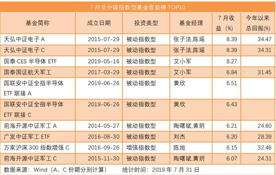 A股市场里流行一句话:五穷六绝七翻身。从主要指数表现来看,7月里,除上证综指微跌1.56%外,深证成指和创业板指分别上涨了1.62%和3.9%。虽然主要指数表现平平,但是其中也不乏亮眼的高光时刻。例如,科创板22日开市一天就造就125位亿万富豪,普通投资者通过基金参与科创板最高一天赚得9.45%。时值月末,理财不二牛盘点7月基金投资关键词,看这些翻身“基”会你抓住了吗? 主动管理:本月最高赚得13.16% 想要赚得高收益就必须在投资上花心思。作为金融强国的重要战略部署,科创板潜藏着巨大的机会,而作为普通投资者,想要分享科创板红利的最佳方式就是借道公募基金。截至7月31日晚十点半统计时,Wind数据显示,7月非分级主动管理基金业绩前十的基金中有6只参与了科创打新,其中7月业绩最高的一只收益超13%。 Wind数据显示,7月所有非分级基金中收益最高的是财通成长优选,7月取得了13.16%的成绩。该基金获配科创板新股1344.73万元,自22日科创板开市后有三天单日涨幅超2%。紧随其后的是财通价值动量和万家成长优选A,7月收益为13.04%和12.46%,数据显示,两只基金获配科创新股金额分别为1385.27万元和435.58万元。 此外,金信智能中国2025、财通多策略福鑫、银河创新成长、财通集成电路产业A、银华内需精选、长盛生态环境主题和华安智能生活均榜上有名,7月收益均不低于10%。其中,金信智能中国2025、银河创新成长和华安智能生活均获配有科创新股,金信智能中国2025更是在科创板开市当天赚的9.45%的收益。 佛系投资:军工电子类指数收益居前 选择主动管理基金要选公司、选基金经理、选行业选主题……,虽说是交给专业的人在打理,但其中蕴藏着很多自己对市场对投资的判断和理解,选一只好的主动管理基金不比选一只好股票简单。如果不想耗费太多精力,布局指数基金是佛系投资的一个好方式。 在七月里,军工电子类指数取得了十分不错的收益,多只出现在7月指数基金收益榜前十。Wind数据显示,张子法和陈瑶管理的天弘中证电子A份额和C份额夺得了7月冠军,收益达到8.39%,今年来总回报超34%。紧随其后的是艾小军管理的国泰CES半导体ETF和国泰国证航天军工,7月分别取得8.27%和6.84%的收益,此外,黄欣管理的国联安中证全指半导体ETF联接A也获得了6.51%,进入该榜单前五。值得注意的是,国泰CES半导体ETF和国联安中证全指半导体ETF联接基金是今年5月和6月才成立的新基金。