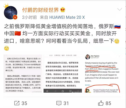 | 8月26日,据微博博主“付鹏的财经世界”消息,“之前俄罗斯降低黄金增值税的传闻落地,俄罗斯、中国均一方面实际行动买买买黄金,同时放开进口”。