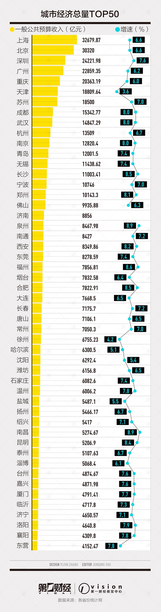 城市经济50强:江苏最多 山东第二 根据第一财经记者统计,50强城市GDP之和达到496065亿元,占全国的55%左右。从入围门槛来看,今年第50名的东营GDP为4152.47亿元。 50个城市中,GDP超过5000亿元的城市已经达到42个,超过万亿元的城市达到16个,比上一年增加两个,新成员分别是宁波和郑州。这16座城市的GDP之和达到27.95万亿元,占全国GDP比重为31%。可见GDP万亿俱乐部城市、中心城市对我国经济驱动作用日益凸显。 从行政级别来看,这16座城市包括四大直辖市,8个副省级城市广州、深圳、武汉、成都、杭州、南京、青岛、宁波,省会城市长沙和郑州,以及普通地级市苏州和无锡。按四大区域划分来看,东部沿海发达地区有11个城市,中部有3个,西部有2个,中西部入围的城市均为直辖市和强省会。 那下一个加入GDP万亿俱乐部的城市会是谁?从数据上看,佛山(9935.88亿元)已无悬念,此外济南在去年底合并莱芜后,新济南实力大增,GDP达到8856亿元左右,位居第18位。新济南与泉州、南通、西安、东莞构成8000亿元梯队,成为GDP万亿俱乐部的后备军。 2018年,我国GDP十强城市分别是上海、北京、深圳、广州、重庆、天津、苏州、成都、武汉和杭州。其中,前五个城市的GDP均已超过两万亿元,上海和北京均超3万亿元。 从50强城市的区域分布来看,东部沿海有35个,占70%;中西部共11个,占22%;东北共4个,占8%。 从城市群的分布来看,作为我国实力最强的城市群,长三角城市群共有16个城市入围50强,此外珠三角和京津冀各有4个城市入围。 从省份分布来看,第二经济大省江苏最多,有9个城市入围50强,分别是苏州、南京、无锡、南通、常州、徐州、盐城、扬州和泰州,其中苏南4城、苏中3城、苏北2城。过去很长一段时间里,江苏南北差距较大,但近年来随着苏南地区进入产业结构调整和转型升级阶段,经济增速放缓,同时江苏区域均衡发展持续推进,不少产业向苏中、苏北转移,三个区域之间的差距不断缩小。 第三经济大省山东入围50强的城市也达到8个之多,第四经济大省浙江入围城市达到6个。 相比之下,连续30年经济总量居全国第一的广东,入围城市仅4个,分别是深圳、广州、佛山和东莞。这与广东省内区域经济差距大,珠三角与粤东西北发展失衡有关。 四大一线城市中,广东就坐拥深圳与广州两个。数据显示,2018年,广深的GDP之和达到47081亿元,占全省的45.3%,如果再加上佛山和东莞,四座城市的GDP之和就占全省的67%。但省内排名第五的惠州去年GDP仅为4103亿元,不到第四名东莞的一半。况且广东还有8个市的GDP在2000亿元以下。 但广东这种大城市引领的模式也有其明显的优点。华南城市研究会副会长孙不熟说,江苏和广东的GDP虽然相差不大,但在财政收入、本外币存款、上市公司、世界500强等指标上,江苏和广东的差距就拉开了。一个重要原因就是江苏缺少广深这样的聚集高端服务业的超级大城市。 江苏省社科院研究员田伯平也认为,广深作为两大一线城市,集聚高端要素的能力更强,现代服务业更发达,对珠三角地区的转型升级起到非常重要的服务和带动作用。相比之下,无论是苏州还是南京,江苏中心城市的带动作用都与广深有较大差距。 十大地级市:苏州“无敌手” 50强城市中有苏州、无锡等24个普通地级市。