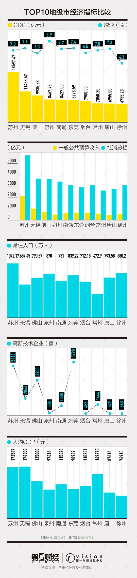 从区域分布上看,这24个城市中,有22个来自东部沿海地区,而整个中西部和东北地区仅有两个普通地级市,即河南洛阳和湖北襄阳。 作为千年古都,洛阳在中部地区的地位和作用至关重要。厦门大学经济学系副教授丁长发对第一财经记者分析,作为“一五”期间国家重点建设的重工业城市,当时国家在洛阳投了很多项目,洛阳有着雄厚的工业基础,也是河南省的第二大城市。 总体上看,在中西部地区目前经济发展的过程中,省会城市与非省会城市差距十分明显。虽然省会城市对区域经济的带动作用很关键,但中西部也需要培育更多的省域副中心城市。比如,河南将洛阳作为省域副中心城市打造,湖北也在积极打造襄阳和宜昌这两个省域副中心城市。 按GDP总量的大小来看,普通地级市前十强分别是苏州、无锡、佛山、泉州、南通、东莞、烟台、常州、唐山、徐州,全部来自东部沿海地区,其中江苏最多,一省就占了5个,此外广东有2个,福建、山东和河北各1个。 值得一提的是,尽管江苏的强市最多,但在东部沿海几个发达省份中,广东、浙江、福建、山东以及曾经经济较为发达的辽宁都有一个计划单列市,唯独江苏由于复杂的历史原因没有计划单列市。 但尽管没有计划单列、副省级城市这样的头衔,苏州的经济总量也不比很多副省级城市差。十年前苏州的经济体量位居全国前五,仅次于北上广深,这些年虽然有些下滑,但仍位居第七,一直都是最牛的地级市。 改革开放之后,靠近上海的苏南地区凭借外向型产业的发展,经济也随之高速发展。2018年,苏州辖下的三个县级市昆山、张家港、常熟的GDP都已经超过2000亿元大关。其中昆山是台商投资集中区,曾以“笔记本电脑之城”闻名,高峰时期全球新上市的笔记本电脑每三台就有一台产自昆山。 再从各个主要经济指标来看,苏州在普通地级市中堪称“无敌手”。2018年,苏州GDP达到18597亿元,领先第二名无锡7000多亿元;地方一般公共预算收入2120亿元,是第二名的两倍多;资金存量是28560.4亿元,比第二名多了1.2万亿元左右;社会消费品零售总额5746亿元,超第二名2000多亿元;只有在人均GDP上略输无锡,在高新技术企业数量上略落后于东莞。 当然,包括苏州在内,这些以制造业为主的普通地级市普遍存在一个问题,就是下辖县市县域经济发达,但中心城区规模不够大、不够强,不同程度上存在“小马拉大车”的现象。 华南城市研究会会长、暨南大学教授胡刚对第一财经记者分析,这些以制造业为主的普通地级市,服务业占比和发展层次都赶不上一线城市以及强省会城市,他们想要进一步发展就要把金融、商贸等现代服务业、高端服务业做好,而现代服务业要发展,就必须要把中心城区做好,把交通、教育、医疗等短板加快补齐。 事实上,目前包括苏州在内的地级市都在积极补齐公共资源方面的短板。比如,8月24日,据苏州市交通运输局消息,苏州市已经完成了苏州机场的规划选址、空域研究等前期工作。此外,南京大学苏州校区建设的前期准备工作正在有序推进中,预计今年10月开工建设,2021年9月开始招生。 不过,目前十大地级市的发展也出现了一些明显的分野。除了加快做强做优主城区之外,部分靠近核心大城市的普通地级市,得益于核心大都市的外溢,产业转型升级不断加快,高新产业发展水平位居前列。这些城市正在与核心大城市一起,打造大都市圈,形成产业的梯度合理分配。 例如,东莞近年来受到深圳的外溢作用十分明显,目前东莞的高新技术企业数量达到了5798家,位居十大地级市之首,在全国各城市中位居第五,仅次于北上广深。此外,苏州也不遑多让,高新技术企业数量达到5416家,佛山和无锡也分别达到了3900家和2064家。 相比之下,远离核心大都市的普通地级市,在高新技术产业发展方面都要逊色不少,比如泉州的高新技术企业只有508家,烟台只有453家。未来这些城市在加快产业转型升级等方面需要多下一番功夫。 责任编辑:刘文强 |