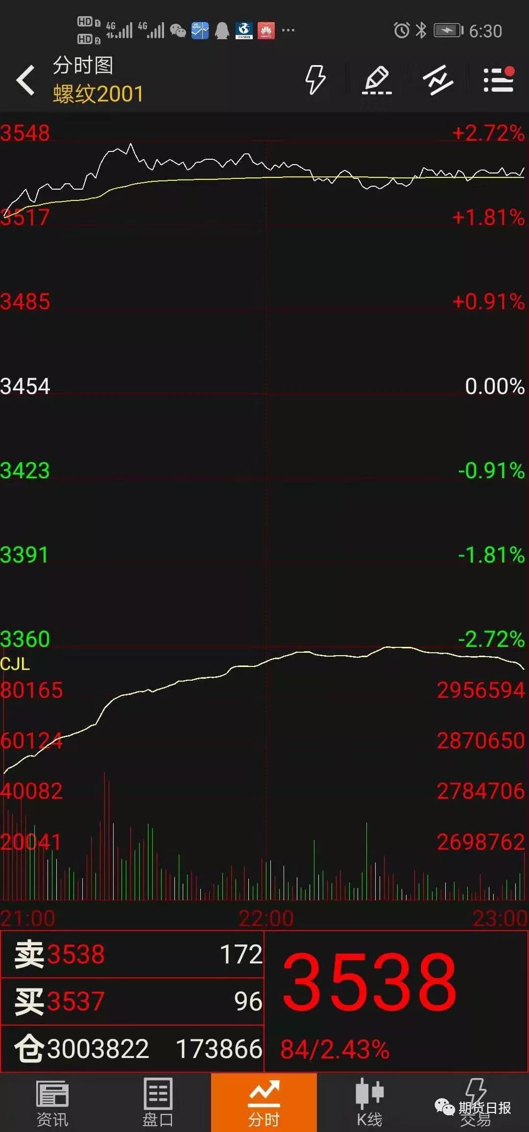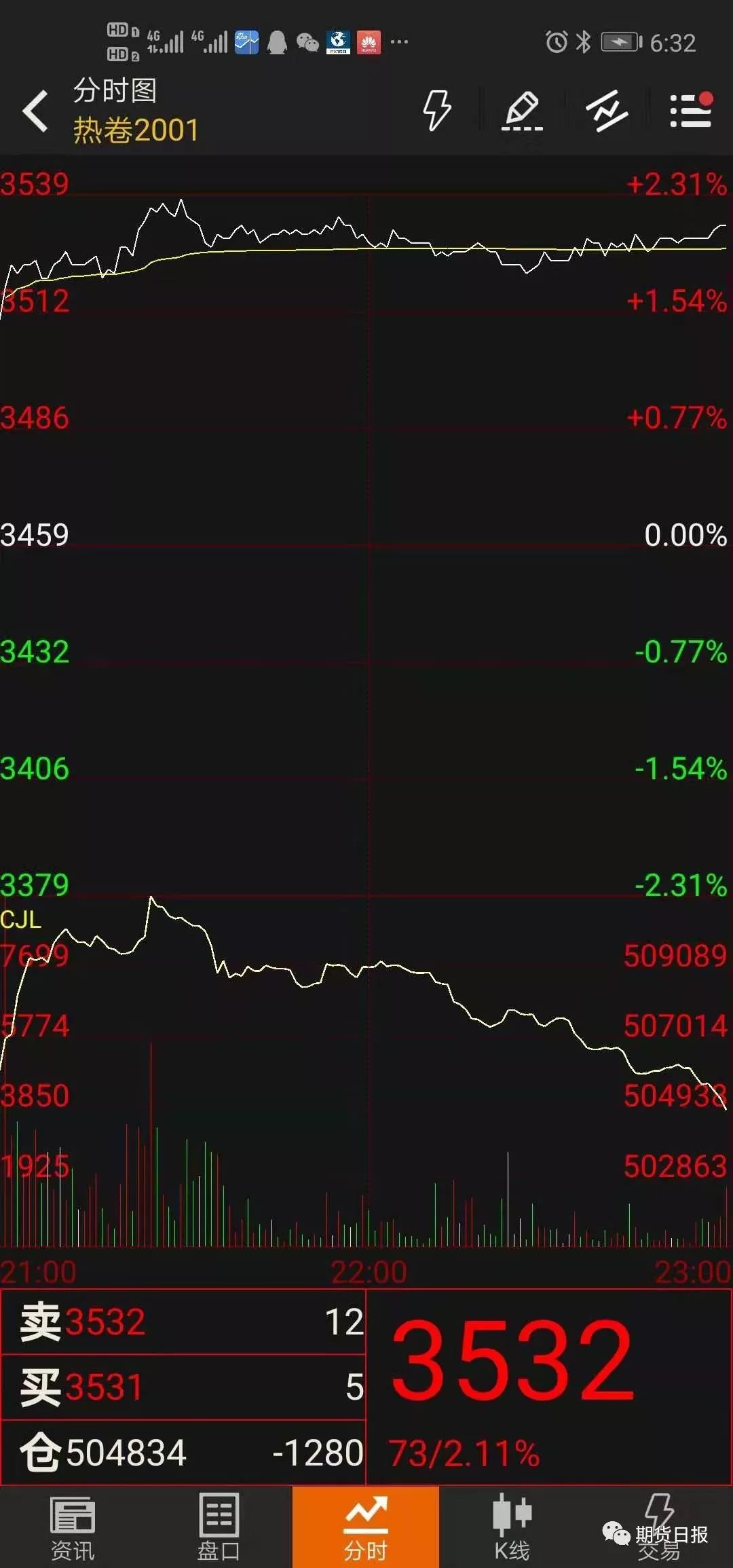 | 昨日,环保限产“突袭”,钢价涨“红了脸”。 对于周一盘中的螺纹钢期货,多头纷纷表示幸福来得太突然,空头小伙伴则被砸得有点蒙,有投资者调侃道:“空头一开始都抢着上车,后来发现上了辆翻斗车。” 每日开盘,总会有人哭有人笑,不过这次的限产有点猝不及防,加之临近国庆长假,今年较之前国际形势更为复杂,准备持币过节的投资者较多,长假前的交易也愈发谨慎,有交易人员说,大户开始陆续平仓了,准备过节…… 截至9月23日下午收盘,螺纹2001合约报收3510,涨3.60%;热卷2001合约报收3509,涨2.99%;铁矿石2001合约报收647.5,涨2.37%;焦炭2001合约报收1982,涨1.95%;焦煤2001合约报收1300,跌0.08%。 23日夜盘,螺纹、热卷强势延续,但铁矿、焦炭涨幅回落。螺纹2001合约报收3538,涨2.43%;热卷2001合约报收3532,涨2.11%;铁矿石2001合约报收639,涨0.16%;焦炭2001合约报收1975,涨0.61%。