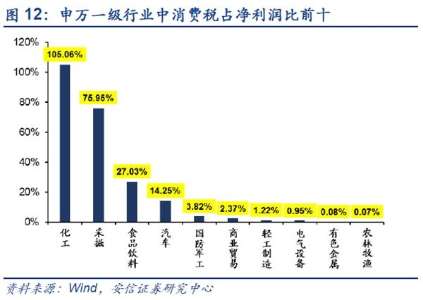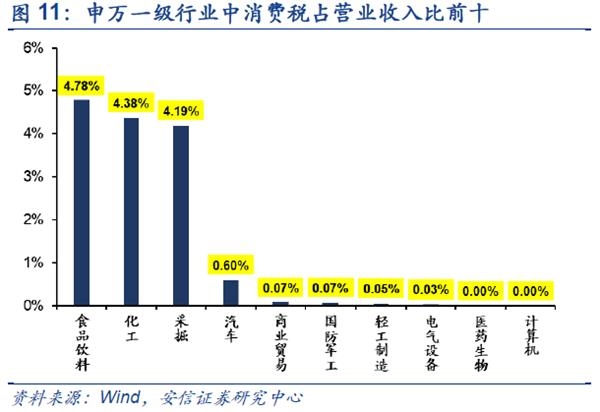 4、消费税征税后移:补充地方收入,对生产企业影响有限 消费税征税后移并下移地方核心在于进一步落实减税降费,正面意义更加明显。10月9日,中国政府网发布《实施更大规模减税降费后调整中央与地方收入划分改革推进方案》(以下简称“方案”)。其中,对于消费税后移消费税征收环节并稳步下划地方。我们认为从生产环节移动到批发零售环节更符合消费税本质,在哪里消费就在哪里收税,同时也有助于拓展地方收入来源,引导地方改善消费环境,整体对消费品生产企业影响并不大,正面意义更加明显。 消费税征税环节后移后会有可能使得部分消费品的消费税上升。《方案》提出消费税征税环节后移批发零售环节,计税依据将有可能由出厂价扩大为批发价或者零售价,消费税会进一步提升。因此,在原来生产环节征税且按照在从价计征的消费品中,出厂价和批发或者零售价差别越大的,其消费税变化也就会越明显。而对于从量计征的商品则没有影响(例如烟、除白酒外的其他酒类等)。从目前来看,贵重首饰和珠宝玉石税目下金银首饰已为零售环节征税,边际变化仅为贵重首饰和珠宝玉石的其他品类。 消费税征税后移且下移总体对消费品生产企业正常生产经营影响不大。但区别于增值税,由于消费税是价内税,企业当期缴纳消费税的金额发生变化,其净利润也会发生相应的变化。同时,地方政府也存在扩大征收的激励,增加企业的消费税负担。因此,消费税可能存在的增大趋势或将会对企业生产经营造成负面影响。我们认为负面影响有,但整体有限。从企业的角度来看,需要注意的是消费税是流转税,由企业生产者缴纳,最终由消费者承担。因此,企业有可能通过提升消费品价格来对冲消费税存在的负面影响。从政府的角度来看,今年来消费税我们认为消费税在我国的税制体系中是个小税种,2018年占比税收收入在7%点左右(约1.1万亿),地方政府不大可能将其作为拓展为主要税源,平衡央地财权和事权需要依靠更大的税种,例如企业所得税或者增值税。因此,我们认为消费税征税后移且下移对于在地消费品生产企业正常生产经营影响并不大。 消费税后移短期对珠宝影响有限,有利于免税板块。从目前来看,《方案》提出,“对高档手表、贵重首饰和珠宝玉石等条件成熟的品目实施改革”,根据安信商社团队的研究,对珠宝板块有一定影响、但影响较小;对化妆品板块几无影响,同时有利于免税板块。而从目前消费税结构来看,油、烟、酒和汽车这四类消费品贡献约80%以上的消费税。从上市公司层面来看,这四类企业中消费税占利润比例并不低。如果按照目前的改革方案来看,以上四个品类中白酒将受到一定影响,但我们认为程度有限。 《方案》提出改革内容的核心意义在于进一步落实减税降费。《方案》中提出实施更大规模减税降费是应对当前经济下行压力的关键之举,调整中央与地方收入划分改革是落实减税降费政策的重要保障。这就意味着将消费税并划归地方,不仅是财政分权的进一步完善,而且是用来弥补和缓解地方政府在减税降费中收入下行的损失和压力。换个角度说,如果地方的收入没有得到合理的补充,未来进一步减税降费可能就很难继续进行。