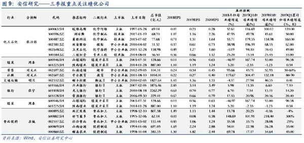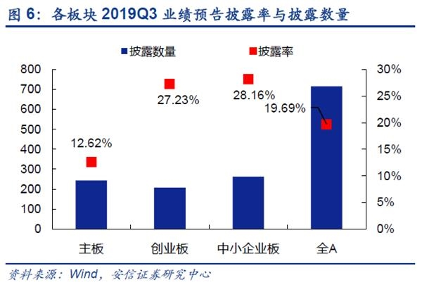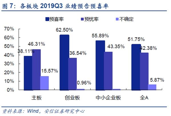 我们认为,这对于当前A股可以提供一定启示:经历了显著的结构性牛市之后,场内资金兑现收益诉求较强,由于外部因素暂难出现重大的新推动逻辑,在显著的政策宽松加码尤其是增量资金入市出现之前,A股可能要进入一个阶段的休整期,这个休整期可以看成是结构性牛市走向全面牛市的过渡期。在这个过渡期,市场整体性机会有限,战术上可以适度关注低估值补涨板块。 3、短期继续关注三季报业绩 我们此前提出市场在十月的主线是围绕三季报高景气和超预期的绩优股展开行情,我们认为该主线还将继续。 对于三季报,我们认为全A业绩整体将略好于市场预期,成长行业盈利有望进一步修复。截止10月13日,全部A股共有715家A股上市公司披露三季报业绩预告,整体披露率为19.69%。由于整体披露率不高,数据代表性不强。但从目前板块角度来看,创业板业绩出现了较为明显的环比改善,预喜率达到62.50%,要高于主板和中小企业板。虽然宏观经济增速趋于下行,但我们认为中观层面一个积极因素是,在去杠杆压力缓解下,企业之间恢复正常的商业信用,资产负债率和经营性负债率也有望修复,另一方面A股(非金融石油石化)融资成本下行0.53pct至4.07%,使得ROIC-WACC恢复至正值区间0.30,这也标志着上市公司进入创造价值区间。