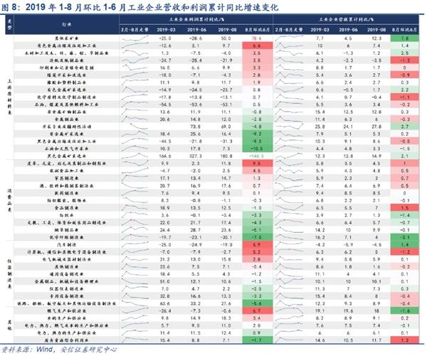 行业层面,以电子、通信乃至计算机为代表的成长行业利润进一步回升。我们参考同期工业企业利润,并认为计算机、通信和其他电子设备制造业盈利大概率将在Q3出现明显好转,尽管1-8月营收累计同比增速(+5.0%)依旧环比1-6月(+6.2%)小幅下滑1.2pct,但1-8月利润总额累计同比增速-2.7%,环比1-6月上升5.2pct。在消费板块,农产品、家具和医药Q3盈利环比改善明显。其中,皮革、毛皮、羽毛及其制品和制鞋业环比改善明显主要为1-6月低基数),医药制造业1-8月利润总额累计同比增速9.5%,环比1-6月小幅提高0.1pct。 从工业企业利润角度来看,1-8月环比1-6月累计同比增速变化靠前的行业有:皮革、毛皮、羽毛及其制品和制鞋业(+9.5pct)、燃气生产和供应业(+6.7pct)、有色金属冶炼及压延加工业(+6.6pct)、汽车制造(+5.9pct)、计算机、通信和其他电子设备制造业(+5.2pct)、农副食品加工业(+4.5pct)、木材加工及木、竹、藤、棕、草制品业(+3.5pct)、造纸及纸制品业(+3.5pct)、水的生产和供应业(+3.4pct)、印刷业和记录媒介的复制(+3.3pct)。 从工业企业营收角度来看,1-8月环比1-6月累计同比增速变化靠前的行业有:开采专业及辅助性活动(+3.7pct)、木材加工及木、竹、藤、棕、草制品业(+2.5pct)、有色金属矿采选业(+2.2pct)、黑色金属矿采选业(+2.1pct)、食品制造业(+1.5pct)、有色金属冶炼及压延加工业(+1.4pct)、汽车制造(+1.4pct)、废弃资源综合利用业(+1.2pct)、皮革、毛皮、羽毛及其制品和制鞋业(+1.0pct)、家具制造业(+0.7pct)