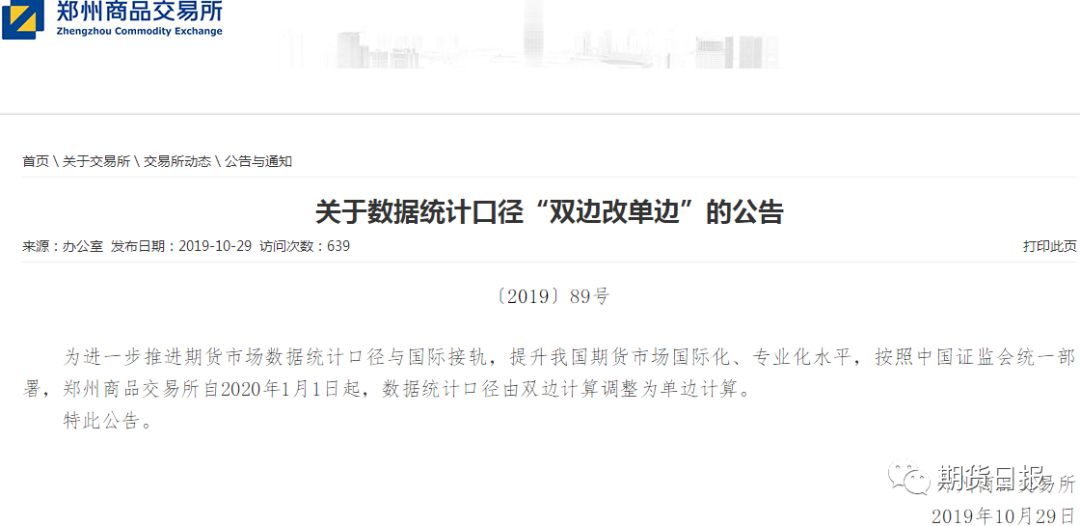 | 昨日,国内三家商品期货交易所同时发布数据统计口径“双改单”的公告,引起市场关注。为什么需要更改,更改又是怎么回事,会给投资者们带来什么变化呢? 从各期货交易所的公告内容来看,将数据统计口径“双边改单边”计算主要是为了为进一步推进期货市场数据统计标准与国际接轨,提升我国期货市场国际化、专业化水平,主要是针对成交量和持仓量的定义。