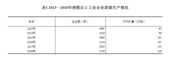 企业生产规模显著扩大。2018年,有原煤生产的规模以上工业企业共计2556家,比2013年减少47.7%;户均产量140万吨,比2013年增加59万吨,增长72.8%。其中,年产量90万吨以下的小型原煤生产企业2237家,比2013年大幅减少2290家,产量占比14.4%,比2013年降低3.9个百分点。