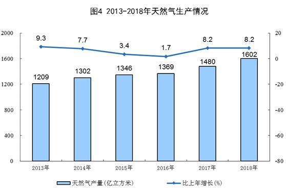 地方炼厂占比提高。自2015年起,我国原油非国营贸易进口配额大幅增长,2018年比2013年增长389.4%,年均增长37.4%。2018年,地方炼厂加工原油9665万吨,占全国原油加工量的16.0%,比2013年提高9.1个百分点。 三、天然气稳步增产,非常规天然气占比近30% 近年来,随着天然气产供储销体系建设稳步推进,国内气田勘探开发力度明显加大,西南、长庆等常规天然气主力气田以及非常规天然气井增产上储形势良好,全国天然气产量稳步增长,连创新高。 天然气连续两年增产超百亿立方米。2018年,天然气产量1602亿立方米,比上年增产122亿立方米,常规天然气和非常规天然气分别增产94亿立方米和28亿立方米。与2013年比,天然气产量增长37.5%,年均增长6.6%。