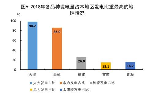 火电比重下降。2018年,火力发电量50963亿千瓦时,比2013年增长20.0%,远低于清洁能源发电71.8%的增速。火力发电占比71.5%,比2013年下降6.7个百分点,电力生产清洁低碳化趋势明显。分地区看,山东、江苏、内蒙古和广东火力发电量分列前四位,2018年分别为5525、4578、4164和3468亿千瓦时,合计占全国的34.8%。 水电稳步增长,水能资源富集地占比继续提高。2018年,水力发电12318亿千瓦时,比2013年增加3115亿千瓦时,5年间年均增长6.0%。分地区看,四川、云南和湖北水力发电量分列前三位,分别为3163、2695和1465亿千瓦时,合计占全国水电总量的59.5%,占比比2013年提高6.7个百分点。 核电连续5年保持15%以上增长。2018年,全国核能发电量2944亿千瓦时,比2013年增长163.7%,年均增长21.4%。分地区看,核电站主要分布于东部和南部沿海的辽宁、山东、江苏、浙江、福建、广东、广西和海南8个地区。其中,海南、广西和山东地区的核电站分别于2015、2016和2018年正式投产运行。 风电高速增长,西电东送保障风电消纳。2018年,风力发电量3553亿千瓦时,比2013年增长151.6%,年均增长20.3%,占全部发电比重为5.0%,比2013年提高2.4个百分点。随着内蒙古上海庙至山东临沂等特高压“西电东送”通道建成投产,跨区电网输送能力进一步提升,风电消纳能力不断提高。其中,内蒙古作为我国最重要的风电基地,2018年风力发电量629亿千瓦时,占全国的17.7%;内蒙古、新疆和甘肃等西部风电富集地区风力发电量占本地区发电量比重均超过10%。 太阳能发电迅猛增长。2018年,太阳能发电量1536亿千瓦时,比2014年增加1284亿千瓦时,年均增长57.2%。分地区看,太阳能发电最多的四个地区是青海、新疆、内蒙古和河北,分别为131、129、125和124亿千瓦时;占本地区发电比重超过5.0%的地区分别为:青海16.2%、西藏8.7%、甘肃6.0%和宁夏5.7%。