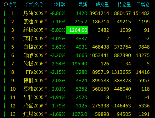 | 4月27日,国内期市多数收跌,燃油跌近9%,原油跌超7%。基本金属全线上涨,沪锡涨逾3%,沪锌涨逾2%;农产品多数下跌,白糖跌逾3%,棕榈油、豆油跌逾2%,苹果则涨逾7%;黑色系多数下跌,焦煤、动力煤跌逾1%。