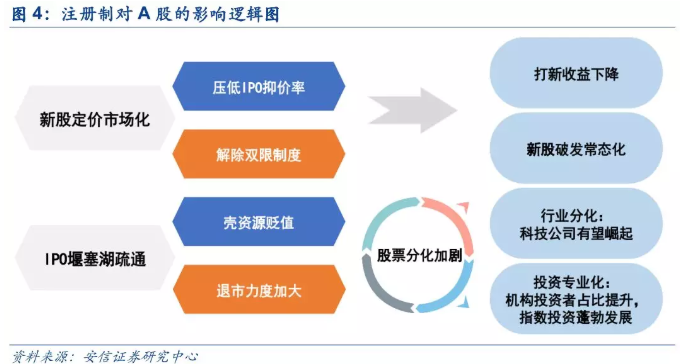 科创板重要消息发布节点与万得创投指数走势 创业板注册制会为带来哪些影响? 安信证券认为,一方面与注册制接轨必然带来新股定价逐步市场化,从而解除“双限制度”,压低IPO抑价率,带来打新收益下降,新股破发常态化;另一方面,注册制的实施意味着IPO堰塞湖疏通,IPO难度的降低使得借壳上市的吸引力降低,壳资源将贬值,与此同时,注册制的推进和退市力度的加大是一个硬币的两面,导致股票分化加剧,带来行业分化和投资专业化。此外,注册制将进一步加强金融对实体经济的支持,为现阶段无法盈利但是成长性良好,处于“风口”的高科技公司带来机遇。