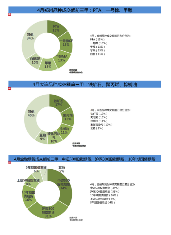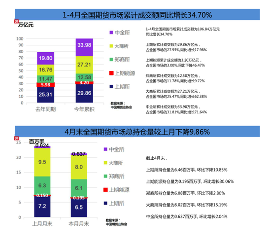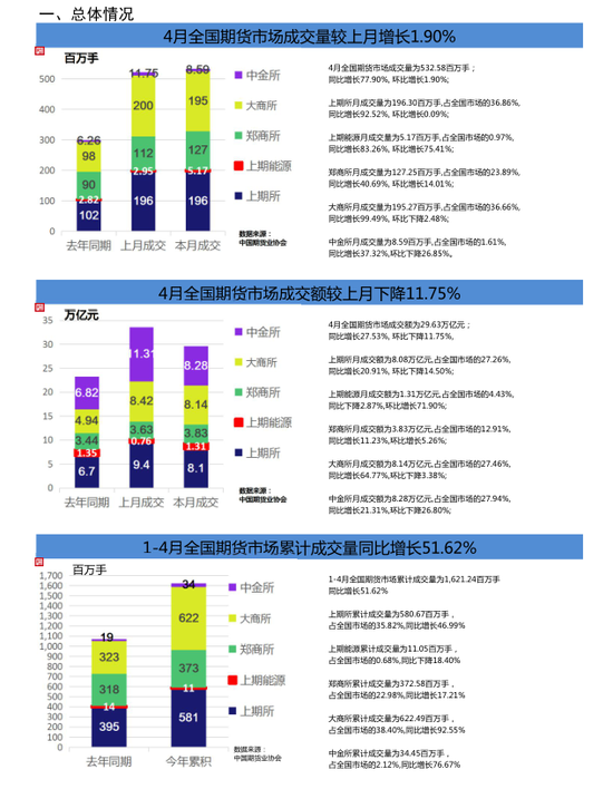 上海期货交易所4月成交量为196,304,190手,成交额为80,785.14亿元,分别占全国市场的36.86%和27.26%,同比分别增长92.52%和20.91%,环比分别增长0.09%和下降14.50%。4月末上海期货交易所持仓总量为6,457,171手,较上月末下降10.85%。1-4月上海期货交易所累计成交量为580,672,640手,累计成交额为298,620.35亿元,同比分别增长46.99%和17.98%,分别占全国市场的35.82%和27.95%。 上海国际能源交易中心4月成交量为5,165,918手,成交额为13,128.34亿元,分别占全国市场的0.97%和4.43%,同比分别增长83.26%和下降2.87%,环比分别增长75.41%和71.90%。4月末上海国际能源中心持仓总量为195,366手,较上月末增长30.06%。1-4月上海国际能源中心累计成交量为11,053,370手,累计成交额为32,001.70亿元,同比分别下降18.40%和46.47%,分别占全国市场的0.68%和3.00%。 郑州商品交易所4月成交量为127,248,742手,成交额为38,260.25亿元,分别占全国市场的23.89%和12.91%,同比分别增长40.69%和11.23%,环比分别增长14.01%和5.26%。4月末郑州商品交易所持仓总量为6,079,228手,较上月末下降2.80%。1-4月郑州商品交易所累计成交量为372,578,913手,累计成交额为125,832.14亿元,同比分别增长17.21%和9.72%,分别占全国市场的22.98%和11.78%。 大连商品交易所4月成交量为195,266,052手,成交额为81,367.76亿元,分别占全国市场的36.66%和27.46%,同比分别增长99.49%和64.77%,环比分别下降2.48%和3.38%。4月末大连商品交易所持仓总量为8,017,477手,较上月末下降15.19%。1-4月大连商品交易所累计成交量为622,493,515手,累计成交额为272,130.95亿元,同比分别增长92.55%和62.38%,分别占全国市场的38.40%和25.47%。 中国金融期货交易所4月成交量为8,592,946手,成交额为82,780.75亿元,分别占全国市场的1.61%和27.94%,同比分别增长37.32%和21.31%,环比分别下降26.85%和26.80%。4月末中国金融期货交易所持仓总量为636,977手,较上月末增长2.04%。1-4月中国金融期货交易所累计成交量为34,445,359手,累计成交额为339,830.35亿元,同比分别增长76.67%和71.64%,分别占全国市场的2.12%和31.81%。