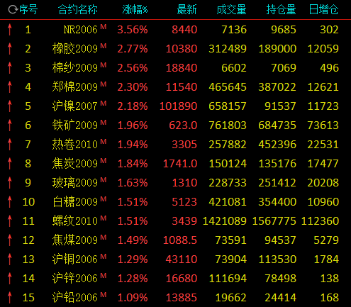 | 5月7日,国内期市收盘涨跌不一,黑色系集体上涨,铁矿石、热卷涨近2%,焦炭、焦煤、螺纹涨逾1%;能化品多数下跌,苯乙烯跌逾3%,甲醇跌逾2%,20号胶则涨逾3%,橡胶涨逾2%;基本金属多数上涨,沪镍涨逾2%,沪铜、沪锌涨逾1%;农产品飘红,棉纱、郑棉涨逾2%。