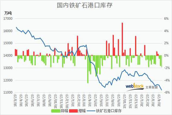 黑德兰港4月对华发运铁矿石3,870万吨,同比增10.6% 据文华财经,外电5月8日消息,澳大利亚皮尔巴拉港务局周五公布,黑德兰港4月对华发运铁矿石3,870万吨,较上年同期增长10.6%,但较3月份的4043万吨下滑4.2%。 4月份黑德兰总计发运铁矿石4200万吨,低于3月份创下的史上第三高水平4670万吨。 澳大利亚四大铁矿石生产商中的三家(必和必拓、福特斯库金属集团和Roy Hill)均通过黑德兰港出口铁矿石。 钢厂采需旺盛 国内铁矿石港口库存创2017年以来新低 钢材需求旺季,钢厂生产兴致高涨令铁矿石采需旺盛,港口铁矿石日均疏港量连续两周处于310万吨上方,尽管外矿到港情况逐渐好转,但据我的钢铁网调研结果显示,全国45个港口铁矿石库存本周仍大降209.07万吨或1.83%至11188.96万吨,创2017年以来新低,较去年8月库存最低点仍低400万余吨。 注:国内铁矿石港口库存,主要由钢厂协议矿、贸易矿以及部分矿企存货三部分构成,呈现一定的周期性,受下游钢铁行业需求及矿山生产供应情况影响显著,反映出市场对进口矿的消化能力。
