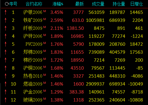 | 5月8日,国内期市收盘多数上涨,黑色系集体走升,铁矿石涨逾2%;能化品涨跌不一,PVC、燃油、玻璃涨逾1%,苯乙烯、塑料、聚丙烯跌逾1%;基本金属多数上涨,沪锌、沪铜涨逾1%;贵金属均上涨,沪金涨逾1%,沪银涨逾3%;农产品分化,郑棉、棉纱涨近2%,菜粕、鸡蛋、豆二跌逾1%。