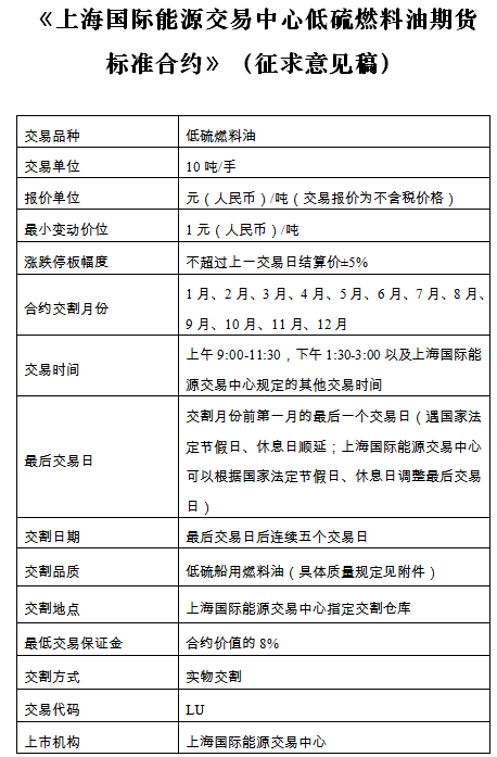 低硫燃料油期货进入上市前冲刺 5月22日,上海国际能源交易中心(下称上期能源)发布公告,就低硫燃料油等期货合约及相关规则公开征求意见。业内人士预计,在相关工作进行完毕后,低硫燃料油期货很快就将正式上市。 据悉,此次公开征求意见的包括《上海国际能源交易中心低硫燃料油期货标准合约》以及《上海国际能源交易中心交易细则》、《上海国际能源交易中心交割细则》、《上海国际能源交易中心风险控制管理细则》等3个实施细则修订案。 低硫燃料油期货合约将继续沿用上期能源“国际平台、净价交易、保税交割、人民币计价”的交易模式,全面引入境外交易者。根据此次公布的低硫燃料油期货合约(征求意见稿),低硫燃料油期货合约交易单位为10吨/手,最小变动价位为1元/吨,涨跌停板幅度为不超过上一交易日结算价±5%,最低交易保证金为合约价值的8%,交割单位为10吨,合约月份为1-12月。