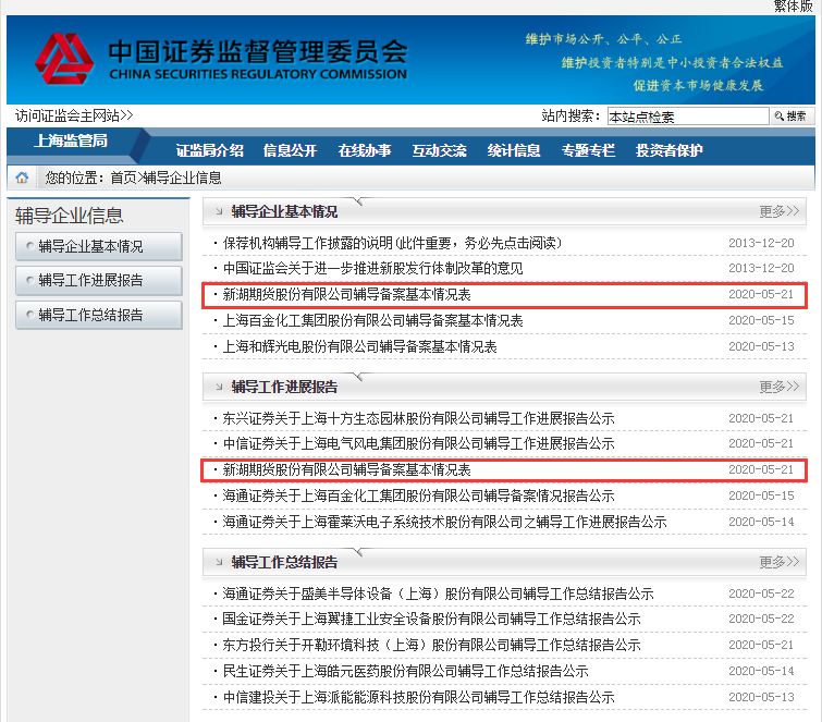 | 继夜盘交易恢复、生猪期货获批后,期货业最新又来一批好消息。 券商中国记者获悉,新湖期货上月完成股改后已火速启动上市辅导。此外商品期货期权市场即将迎来多个新品种,低硫燃料油期货合约及规则,铝、锌期权合约公开征求意见。 新湖期货启动上市辅导 5月21日,上海证监局官网公示了新湖期货股份有限公司(简称新湖期货)辅导备案基本情况表。