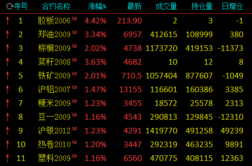 | 5月28日,国内期市收盘涨跌不一;农产品分化,菜籽、菜油涨逾3%,棕榈油涨逾2%,鸡蛋跌逾3%。黑色系多数上涨,铁矿石涨逾2%,热卷涨逾1%;能化品弱势,塑料涨逾1%,沥青、 PVC、苯乙烯下跌;基本金属涨跌互现,沪铝涨逾1%,沪锌、沪铅、沪铜下跌;贵金属均上涨,沪银涨逾1%。