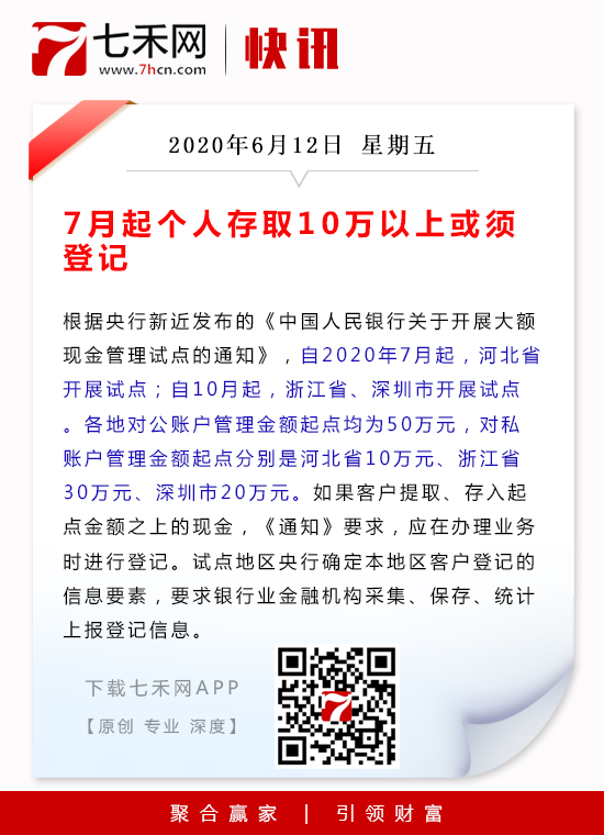 7月起个人存取10万以上或须登记