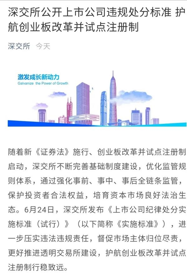 不过,尽管如此,中小券商数量居多也反映出当下这些券商在创业板注册制下的不同处境,和科创板不一样,中小券商在创业板的保荐竞争力度或许更大。 长城证券预计,管理层是考虑到创业板的定位差异,尤其是包括服务于潜在挂牌上市公司的中小券商的资本实力差异,可能未来相对于龙头券商,中小券商预计在创业板的竞争力度加大,与此同时,券商未来投行产业链将更为完善,价值链将更长,包括并购再融资、分拆上市等。未来,在投行领域的分化也将加剧,有望走出更多的精品投行。 护航创业板改革并试点注册制 深交所公开上市公司违规处分标准 6月24日,深交所发布《上市公司纪律处分实施标准(试行)》(以下简称《实施标准》),进一步压实违法违规责任,督促市场主体归位尽责,更好推进透明交易所建设,护航创业板改革并试点注册制行稳致远。 《实施标准》是深交所在前期已发布的三个板块《上市公司公开谴责标准》基础上制定,旨在向市场阐明违规行为责任认定和纪律处分裁量标准。一方面,按照新证券法、创业板改革并试点注册制系列规则等最新监管要求,对纪律处分实施标准予以整合、拓宽与更新;另一方面,坚持“透明搞改革”,切实回应市场需求,主动公开市场关心的监管标准和裁量尺度,避免出现“口袋政策”。
