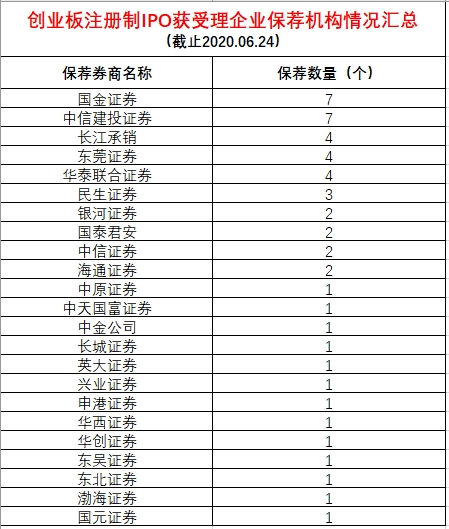 具体来看,国金证券和中信建投证券保荐数最多,均为7家。不过,尽管保荐数量一样,但二者保荐企业的融资金额却差距甚远。 据记者统计,中信建投证券保荐的7家公司合计融资金额为194.27亿元,而国金证券保荐的7家公司累计融资金额则仅为34.05亿元,前者融资总额是后者的近6倍。 长江承销、东莞证券和华泰联合证券均保荐了4家公司,民生证券保荐数次之,达3家;而综合实力排在前十的几家券商,如中信证券、国泰君安和海通证券、银河证券保荐数则并不算多,均只有2家。 与此同时,中原证券、长城证券、兴业证券等13家券商保荐数均为1家,值得注意的是,这其中也不乏中金公司这样投行实力强劲的券商。 中小券商竞争力度或加大 从上述分析可以看出,目前在创业板注册制受理企业的保荐机构中,中小券商保荐数量较多。那么,这是为什么? 有业内人士表示,究其原因,主要是由于在创业板试点注册制实施之日起10个工作日内(6月15日-6月29日),深交所仅受理IPO、再融资、并购重组在审企业提交的相关申请,暂未开放新企业申报,所以前期在审企业较多的保荐券商目前暂居领先地位。 粤开证券估计,6月30日起,深交所将开始接收新申报企业提交的相关申请,预计届时将有大批企业申报。 据了解,创业板注册制允许亏损企业上市并设置行业负面清单,鼓励创新创业企业上市,支持传统产业与创业产业融合。IPO审核流程方面采用与科创板相同的做法,程序分为交易所审核和证监会注册两个环节,流程更加简化,实现受理和审核全流程电子化、全公开流程,深交所审核期限为两个月、证监会注册期限为15个工作日,IPO注册制申报周期将较核准制审核周期大幅缩短。
