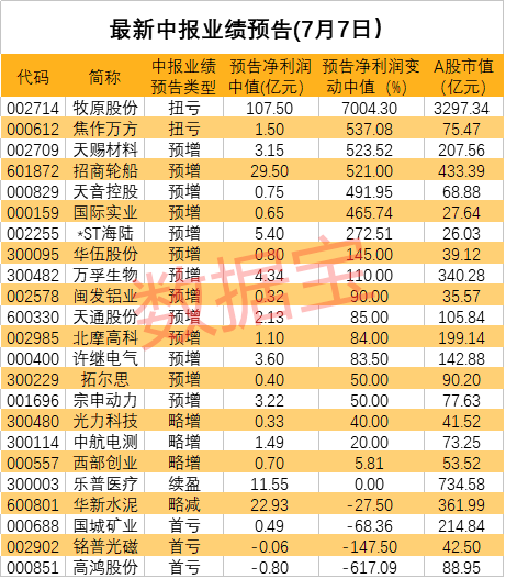 牛市还有多远?头部券商称总市值翻倍 本轮上涨能否引领牛市,上涨的逻辑和动能是否充足? 招商证券认为市场大涨一方面在于近期包含资本市场改革政策的不断落地,体现为政策周期的演绎,中芯国际的科创板上市募资规模超预期、券商行业整合预期,增强了投资者对于做大做强资本市场的信心;另一方面,投资者对于二季度以及下半年经济数据的预期带来金融、周期板块的估值修复;此外,海外资金和居民资金的加速入市,首选券商、低估值板块建仓,更是放大了市场短期的赚钱效应。 后续来看,2020年下半年经济基本面将会持续改善,以金融为代表的低估值板块下半年将会有一波明显估值修复。但从业绩的角度看,应该是传统新兴行业携手业绩改善。总而言之,2014年下半年那种极端的风格转换可能难现,而2020年上半年极端的科技消费医药占优的局面也会被打破,2020年下半年将会呈现轮涨、普涨、混合的风格特征。 光大证券认为,经过近期的上涨,当前投资者普遍对未来行情发展较为乐观。对于市场,长期坚定看好,短期需关注政策信号。长期来看,随着我国经济潜在增长率结束长周期下行,A股也有望迎来过去十年未曾有过的长牛。 中金公司最新报告指出,中国资本市场正在经历新的大发展阶段,估计未来5至10年,中国证券化率将从当前的60%左右,提升至不同国际市场分布的中位数100%附近。同时,中国股市总市值相比当前,可能有翻倍的空间。“老经济”板块中券商的投资机会值得重点关注。从估值上看,券商板块在近期的大涨后估值已经有所抬升,但无论是绝对估值还是相对估值,相比历史区间并不极端,同时下半年景气程度继续改善值得期待。 最新业绩预增股,牧原股份半年净利超百亿 昨晚共有23股发布了中报业绩预告。市值超3000亿的猪肉板块龙头牧原股份上半年受益于生猪价格暴涨,预期实现净利润105亿元–110亿元,同比大幅扭亏。昨日公司股价再创历史新高。 业绩同样大幅扭亏的还有焦作万方,受益于主要原材料价格的下降,公司上半年预期实现净利润1.3亿元-1.7亿元。今年2月,公司股价触及近十年的最低点。当前公司股价距离年内低点已反弹90%,但距离上轮牛市中的最高点的跌幅仍超过50%,最新市盈率29倍。 其他昨晚发布中报业绩预告的个股中,天赐材料、招商轮船、天音控股、国际实业,*ST海陆、华伍股份和万孚生物均预告净利润增速中值翻番。除天音控股外,上述个股中报预告净利润增幅均高于一季报净利润增幅。 证券时报·数据宝统计,6月以来发布业绩预告的A股上市公司中,业绩预喜且净利润增幅下限超过30%的公司共有70家,除去昨晚刚发布预告的公司,其余54股业绩预告次日股价平均上涨了6%,半数个股公告次日股价涨幅超9%。