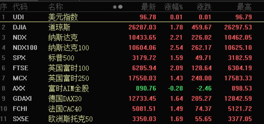 全球股市齐涨,人民币狂拉 除A股外,股市上涨的高昂情绪在全球蔓延。昨夜道琼斯工业指数、标普500指数、纳斯达克指数分别上涨1.78%、1.59%和2.21%,纳指盘中再创新高。中概股集体暴走。老虎证券飙升32.85%,蔚来汽车大涨22.71%,中国人寿大涨23.69%,阿里巴巴涨7.33%。