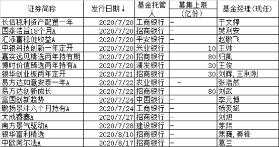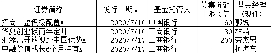 下周值得关注的有嘉实基金归凯管理的嘉实远见精选两年持有期、博时王俊管理的博时价值臻选两年持有、富国李元博管理的富国创新趋势、银华焦巍管理的银华富利精选,以及鹏扬基金总经理杨爱斌亲自管理的鹏扬景沣六个月持有、刘旭的大成睿鑫、茅炜的南方景气驱动、葛兰的中欧阿尔法。其中不少产品有规模上限,有些产品是封闭式产品,投资者关注时需要注意和自己资金使用周期相适应。 这些新基金中不乏具备“爆款”潜质的品种,也可能又出现让行业震惊的认购数据。不过,也有人士认为,因为多只明星基金越来越扎堆发行,由于发行档期较为集中,发行效果可能会因此受到影响。 给市场带来可观增量资金 目前新基金募集速度让人想起了2007年、2015年,这两个牛市阶段市场热情度也非常高,涌现出不少百亿级基金。 据深圳一家大型基金公司市场部负责人预计,伴随市场走强,权益类新基金发行还将火爆,爆款产品应该会纷纷涌现,也会刺激基金公司加大对权益基金布局,增多权益类产品的发行。 往往新基金发行规模是市场一大风向标,爆款基金的频频出炉给市场带来较多增量。 数据显示,5月份以来,先后有募集269.67亿元的易方达均衡成长、募集321.15亿元的南方成长先锋成立,以及上周汇添富和鹏华新基金募集300亿,本周一的华安新基金逼近300亿,直接助推主动权益基金发行总规模,也给市场带来不少增量资金。 仅算7月份以来的权益基金发行规模就超过1000亿,若按照70%仓位计算,近期权益基金差不多给市场带来700多亿增量。若爆款基金持续,这一波市场走强有望继续。 值得一提的是,7月份以来不仅仅是大型基金公司旗下权益基金发行火爆,更有一大批权益新基金宣布提前结束募集。仅7月份以来,就有25只主动权益基金宣布提前结束募集,不少产品都一日售罄。 不过,据深圳一家中型基金公司市场部人士表示,目前市场走强,优秀基金经理的新基金成为爆款是大概率事件。不过,他建议投资者还是需要理性投资,不要盲目跟风,不必过分追捧新基金也可以布局优秀基金经理所管理的老基金。 责任编辑:七禾编辑 |