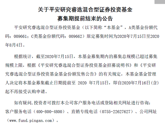 在上周新发基金引来超1300亿资金追捧、创出行业历史纪录的鹏华基金,7月15日又有重量级的新基金发行,是由梁浩和王海青共同管理的鹏华新兴成长。市场也对该基金的发行有所期待,该基金仅在招行一个渠道发行,募集上限为80亿。 据渠道人士消息显示,该基金昨日认购额已经超过募集上限,在下午时候认购金额超过200亿,预计鹏华基金应该也会发布提前结束募集公告,并进行比例配售。 平安基金7月15日新发的产品也获得市场追捧。从渠道消息显示,平安研究睿选热销,早上10点就有百亿资金追捧,超过了募集上限,最后认购量超过200亿。而该基金的募集上限为80亿,该基金妥妥地进行比例配售。 平安基金也快速的发布了相关公告,宣布提前结束募集。公告显示,平安研究睿选混合基金原本募集期为7月15日至8月4日,而截至7月15日,该基金募集总规模已超过募集规模上限,因此将该基金募集截止日提前至7月15日,7月16日(含)起不再接受认购申请。