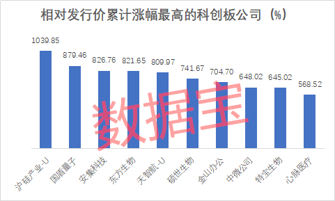 从股价波动来看,上市满一个月的科创板公司中,上市次日起股价日均振幅中位数为5.96%,股价大起大落的现象较少出现,市场交易情绪整体平稳。当前科创板日成交额占A股总成交额的比重约为4.5%,略高于科创板市值在A股的占比,交易活跃度良好。 相对发行价平均上涨200%,诞生过5只十倍股 科创板公司上市以来的整体收益较为可观,今日之前上市的133只个股最新价较发行价平均上涨202.04%,8股较发行价累计涨幅超500%,沪硅产业较发行价已累计上涨了10.4倍,是当前科创板唯一一只十倍股。 若以上市以来的最高股价相对于发行价的涨幅来看,科创板共诞生过5只十倍股,分别是沪硅产业、国盾量子、安集科技、东方生物和天智航。 当前已有6只科创板个股A股市值破千亿,分别是金山办公、中芯国际、中微公司、澜起科技、沪硅产业和寒武纪。