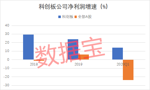 盈利能力和成长性大幅超越A股整体水平 数据宝统计,140家科创板公司2019年净资产收益率(ROE)中位数为12.8%,高出全部A股公司中位数5.4个百分点。科创板公司展现出了更强的盈利能力。 从成长性来看,科创板公司2018年和2019年整体净利润增速均超20%,大幅超越全部A股的净利润增速。今年一季度受疫情影响,全部A股上市公司净利润累计下滑了23.86%,科创板公司净利润却逆势上涨了13.83%,业绩表现坚挺。已发布了中报业绩预告的公司数据显示,东方生物、云涌科技、天合光能和皖仪科技净利润上半年净利润有望翻番。