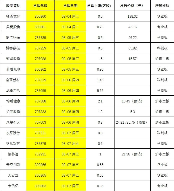 锋尚文化的主营业务以创意设计为核心,业务范围涵盖大型文化演艺活动、文化旅游演艺、景观艺术照明及演绎等多个领域的创意、设计及制作服务。 本周不仅创业板注册制有6只新股发行,同时也是超级打新周,8月3日周一已有2只新股发行,接下来4天还有17只新股等着你。