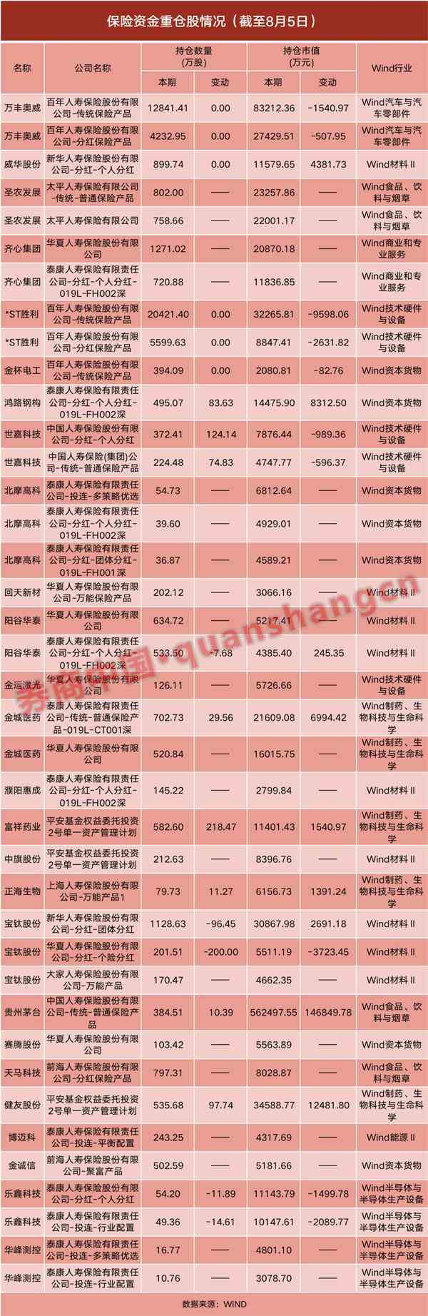 | 随着上市公司二季报逐步披露,保险资金权益投资布局进一步浮出水面。 从目前披露的数据来看,保险公司重仓的26只股票市值为106亿元,重仓行业集中在医药、高科技、消费等行业。需要注意的是,上市公司半年报尚在披露之中,根据以往风格,保险机构持股风格以主板为主,偏好“流动性好、股息率高、盈利能力强”的个股。 据统计,今年二季末,险资投资的股票规模为1.66万亿元,占险资整体比重为8.27%。相较一季度末,保险资金投资的股票规模增加了1200亿元,股票占比环比一季末提升了0.32个百分点。 有保险投资人士表示,险资具有长期投资特性,关注股票长期价值,在一季度坚守不减仓,二季度兑现一定浮盈,同时积极调仓。 加仓医药、科技、消费类股票 目前披露的险资26只重仓个股中,9只重仓股为技术硬件、半导体设备等科技类股票,5只重仓股为医药制造业,4只为食品、饮料等消费类股票。从持仓市值来看,险资持有的食品、饮料等股票市值61.57亿元,医药制造业类股票市值为8.97亿元,科技类股票市值为8.86亿元。 险资在二季度对7只股票进行了加仓,分别为贵州茅台、金城医药、鸿路钢构、世嘉科技、富祥药业、正海生物和健友股份。同时,也对乐鑫科技、宝钛股份和阳谷华泰等3只股票进行了减仓。 从目前数据来看,险资二季度最大的一次加仓是中国人寿加仓股价屡创新高的贵州茅台。今年二季度,中国人寿共计加仓10.39万股贵州茅台股票至384.51万股。截至二季度末,中国人寿持有贵州茅台股票市值增加14.68亿元至56.25亿元。 今年以来,茅台股价屡创历史新高,超越工行成为“A股之王”,总市值超2万亿元。4月1日至6月30日,贵州茅台股价涨33.21%,6月30日收盘价为1463元/股。如果中国人寿持有贵州茅台至6月30日尚未卖出,投资茅台浮盈已超13亿元。 除了国寿精准加仓贵州茅台,泰康人寿二季度也大手笔加仓83.63万股鸿路钢构股票至395万股。截至二季度末,国寿持有鸿路钢构股票市值增加8312万元至1.45亿元。此外,泰康人寿还加仓了29.56万股金城医药至702.73万股,持仓市值增加6994.42万元至2.16亿元。 金城医药和鸿路钢构均为泰康人寿带来了颇丰收益。4月1日至6月30日,金城医药涨幅达到42.92%。鸿路钢构股价在4月1日至6月30日期间涨幅达到了96.38%。 当然,并非险资重仓股票都在短期内实现股价大涨。例如,中国人寿两个账户——个人分红账户和普通保险产品账户,在二季度分别加仓了124万股和74.8万股世嘉科技,但是市值分别减少了989万元和596万元。4月1日至6月30日,世嘉科技股价下跌了11.04%。 险资二季度还有几次减仓,泰康人寿减持了25.6万股乐鑫科技和7.68万股阳谷华泰,新华保险减持96.45万股宝钛股份,华夏人寿减持200万股宝钛股份。