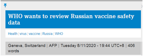 | 俄罗斯总统普京11日宣布,已注册全球首款新冠疫苗。法新社最新报道称,世界卫生组织对此表示,希望审查俄罗斯新冠疫苗安全性的相关数据。