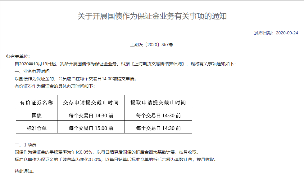 | 上期所9月24日发布通知称,自2020年10月19日起开展国债作为保证金业务。 根据通知,国债作为保证金的手续费率为年化0.05%,以每日结算后国债的折后金额为基数计费,按月收取。以国债作为保证金的,会员应当在每个交易日14:30前提交申请。