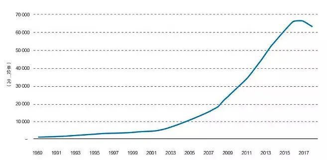 图11 不同国家(地区)人均GDP和人均研发支出对比 来源:世界银行 人均GDP为2017年名义美元数据。 研发支出占比数据除巴西、墨西哥、泰国为2016年数据以外, 其他国家为2017年数据 2. 那么如何释放中国人均GDP的潜能呢?城市化率是另一个重要因素。 所有那些人均GDP较高且研发支出较高的国家的城市化率都在70%左右,而今天中国的城市化率仅有55%。而且这个数字还有些夸大了,因为其中包括了1.8亿农民工,这些农民工虽然在城市生活,但没有城市户口。 只有那些有户口的人才有权享受一系列社会福利,包括教育、退休和医疗福利。有了这些保障后,减少了后顾之忧,人们才会更愿意去消费。因此,这1.8亿农民工并不是城市生活的完全参与者。更不用提那些完全生活在城市之外的45%农村人口了。 然而,中国政府计划在未来20年内将以每年1%的速度开展城市化进程,这意味着在未来20年内,大约有3亿人成为新的消费者。 这正是参与城市化进程的全部意义所在——成为消费者。一旦你真正加入城市生活,有了基本的社会保障,你就会像身边的所有公民一样开始消费,开始赚钱,开始进入到经济循环中去。结果就是可持续的经济增长。 3. 另一个问题是:中国是否有足够资金来支持城市化、支持建设、支持制造业升级?恰巧中国还有另一个特征可以为此助力。 如图12所示,这是中国从1952年到2017年的国民储蓄率。即使在改革开放前,中国的储蓄率也一直居高不下。 非常有趣的是近年来消费水平大幅上涨的同时,储蓄率也在升高。去年(2018年),中国作为世界第二大经济体,其储蓄率仍高达45%。高储蓄率就是支持进一步消费和投资的资源。 高储蓄率还能解决让许多人担忧的一件事——高债务水平。 中国的债务水平自2008年以来一直不断升高,当时中国为应对美国次贷危机引发的全球经济大衰退开始持续大量投资,主要通过发行货币,依靠债务融资。传统上,中国社会融资主要来自银行债务,比例有时可高达80-90%。股票市场及股权融资占整体融资比例很低。 但无论是债务还是股票,它们的来源都是一样的,它们不是从美国或任何其他国家来的,而是直接来自于本国储户。几乎所有中国债务的债主都是中国人自己,并以本币发行。所以尽管债务占比较高,但是因此引发金融危机的可能性至少目前并不高。 下一步中国政府想做的就是通过资本市场改革从根本上改变中国的融资结构,大大增加股权的权重,减少债务所占比例。 新推出的 “科创板”会采用与美国相同的模式,即以信息披露为基础的注册制资本发行,而非以前的审批制。这意味着任何想要上市的公司,都可以在较短的时间内,以较为自由的方式进入资本市场,以自由竞争方式获取资本。 当然政府会在事后对其进行监控。这一模式和美国是相同的。从注册制改革开始,中国会慢慢调整社会融资结构,将银行债务从80-90%的高比例逐步调低。一个复杂成熟的经济体是不应该有这么高的银行债务比例的。因此,资本市场改革将成为解锁高债务比问题和提高融资效率的关键。