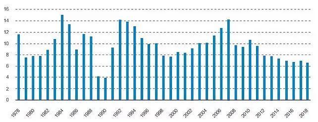 图4 中国1978年到2018年通货膨胀调整后的实际经济增长率 来源:世界银行 下面我来谈谈非常规的解释。 首先,现代文明的本质并非政治制度,而是自由市场经济与现代科学技术的结合。中国人已经在各种不同的方向上跌跌撞撞地走了150多年,直到1978年他们才真正达到了这种结合。 那时,中国已经存在一个潜在的统一市场,还有着统一、稳定的政治环境。一旦真正开始接受现代文明的精髓,中国就像其他现代国家一样开始蓬勃发展。历史上其他国家的经济起飞也是遵循相同的道路。 另一个原因是中国的独特政治经济体系,也被一些学者称为“三合一市场机制”。我们在第一部分说过,中国人最早探索出通过政治贤能制来释放集体力量和潜力的方法。 在过去的40年里,中国又通过组织市场经济的独特方式将这一历史传统发挥得淋漓尽致。所谓“三合一市场机制”,就是中央政府、地方政府和企业之间的密切合作。 中央政府制定战略,提供资源支持,调节经济周期——这一点和美国联邦政府相似。中国的独特之处在于地方政府之间的竞争。 不同的地方政府相互竞争,为商业公司提供更好的服务,和中央政府一起促成了经济的长期增长。从图4中可以看出,多年来中国经济增长率的起伏非常小。这种独特的模式在超长的时间内产生了超高的增长率,且周期性变化非常小。当然周期性变化很小也离不开温和的国际环境和开放的自由交易系统。 然而最近几年,情况发生了变化。 首先,当地方政府像企业一样提供商业服务时,它们会要求租金,有些官员甚至会以权谋私,要求企业直接把租金支付给个人。因此,这种模式在创造了超高速经济增长的同时,也显出了三合一市场机制的缺点。 在此期间,国际环境也发生了变化。当中国成为世界第二大经济体、世界上最大的贸易国和最大的工业国时,其他国家和地区的经济没有达到9%的增速来适应这么多的产出。 此外,全球化的结果之一是,那些原本发达的工业大国正在失去其工业上的优势基础。而全球化为发达国家带来的好处又集中地过度分配给了科技与金融领域中的精英们,贫富分化日益严重,中产阶级的生活水平停滞不前。 于是反全球化运动和各种民粹主义政治运动开始聚集力量。 在中国经济持续增长了40年后,遇到了一些困难。 03 海外投资人的悲观情绪 十八大以来,中国政府发起了可能是最全面、最持久的反腐行动。政府发布了一系列改革计划,同时推行两个并行的政策目标。一个目标是全面从严治党;另一个目标是同时为中国继续创造中高速(相对于超高速)的、可持续的经济增长。 但大多数人都把问题的重点放在了第一个目标,因为它带来的变化很大。 在过去一段时间内,一些人感到难以适应。 中美贸易战爆发后,我们又迎来了新一波的悲观情绪和预测。持这一观点的人怀疑全面从严治党政策的最终目标,甚至怀疑政府推动市场经济改革发展的决心,这是否预示着中国超高速增长的终结? 但是反过来想,加强党的领导也带来了更加稳定的政府、稳定的国家,和稳定、持续、共同、单一的大市场。反腐还有效地遏制了贪腐和寻租行为,将一些根深蒂固的利益集团连根拔除,从而使一些原本很难推行的经济改革成为可能。 我们还看到中国对技术、教育、环境都在持续地加大投资,中国经济也在从出口和投资导向向最终消费导向转型。这几年,我们看到了社会的很多变化,在某些方面,舆论空间收窄,但在另一些方面,这些政策也卓有成效,比如扶贫、环保等,效果可以说立竿见影。这就是这几年中国国内环境发生的变化。 国际上,我们再谈谈贸易战,很多人问到这场贸易战是否预示着中国增长周期的终止。 我们来看一下数据。图5显示的是中国商品及服务净出口占国内生产总值的百分比,它的计算公式是用商品及服务的出口值减去商品及服务的进口值,再除以国内生产总值。历史上的一些时期,中国的净出口曾经非常高,接近国内生产总值的9%。也曾经低到-4%。但在过去的五年里,中国的净出口平均值在2%左右。 再看下图6,你就会明白近些年来国际贸易对中国经济增长影响力的变化了。图6显示的是2003年以来最终消费、投资和商品及服务净出口对中国国内生产总值增长的贡献率。十几年前,净出口对中国GDP的贡献很大,2008年和2009年开始下降(当时中国是支撑全球其他经济体的主要进口国)。过去五年,最终消费的贡献在持续增长,资本形成总额(即投资)相对降低,而净出口显著降低,换句话说,中国经济对国外市场的依赖性显著降低。中国供给侧的经济改革产生了实际的成效。 笼罩在林林种种的担忧、恐惧、抱怨和预言中,中国经济实际上正在悄然发生变化,2018年最终消费对GDP增长的贡献率达到76.2%,资本形成总额贡献率32.4%,货物和服务净出口贡献率为-8.6%。中美贸易冲突固然会对中国经济造成损害和诸多负面影响,但是已不足以阻止中国经济的持续增长。