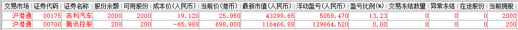 账户初始资金:100000.00元 2015年5月18日入金:32000.00元 2015年5月29日入金:9000.00元 2015年6月23日入金:20000.00元 2015年6月26日入金:10000.00元 2015年6月29日入金:20000.00元 2015年7月3日入金:20000.00元 2015年7月8日入金:10000.00元 2016年1月12日入金:90000.00元 2016年1月22日入金:100000.00元 2016年1月27日入金:100000.00元 2016年3月21日出金:270000.00元 2016年4月12日出金:35639.23元 2016年10月10日出金:56913.08元 2016年10月28日入金:60000.00元 2017年3月7日出金:113800.00元 参考市值:177686.54元 账户资产:178366.33元 截至今日账户A股盈亏:-39291.71元 截至今日账户港股盈亏:134723.99元 账户净值:1.997