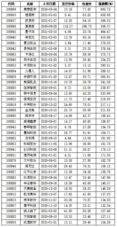 | 自实施注册制以来,创业板挂牌公司已达90家。从走势上看,这些公司挂牌的当天平均涨幅达244%。其中,今年以来挂牌的公司上市首日平均涨幅更是高达259.60%;不过,创业板注册制以来挂牌的公司大部分走势都是“虎头蛇尾”,目前有两家公司已破发。 创业板实施注册制以来挂牌公司90家 首日平均涨幅达244% 近期,新股赚钱效应有所减弱,上市首日开板已逐渐成为普遍现象,新股上涨力度也明显弱于去年同期。不过,创业板新股仍有不俗表现。同花顺iFinD数据显示,2021年以来创业板挂牌公司27家,上市首日这些个股平均涨幅达259.60%。其中,首日收盘涨幅最高的是南极光,达730.96%;最低的是信测标准,涨幅只有48.07%。 事实上,自创业板注册制改革后的首批18家公司2020年8月24日挂牌以来,截止今年3月23日,创业板注册制后挂牌企业数达90家。据同花顺iFinD数据统计,这90家公司上市首日的平均涨幅达244.02%。其中,康泰医学涨幅达1061.42%,是挂牌首日涨幅最高的一家,也是创业板注册制后挂牌公司中唯一首日涨幅超过10倍的公司。而锋尚文化涨幅最低,仅有43.10%。 此外,卡倍亿、南极光、迦南智能、德固特、易瑞生物、大叶股份、惠云钛业等7家公司上市首日涨幅也超过500%,分别达到743.27%、730.96%、693.42%、629.96%、578.72%、561.53%、527.47%。此外,熊猫乳品、恒辉安防、冠中生态、盛德鑫泰等15家公司上市首日涨幅也超过300%。 而上市首日涨幅不到50%的公司中,除了上述提到的信测标准和锋尚文化外,还有维康药业、金春股份、蓝盾光电、海晨股份、南凌科技、回盛生物、杰美特、博硕科技、研奥股份、山科智能、稳健医疗、德必集团、秋田微、润阳科技和美畅股份。 杰美特、海融科技两家公司已经破发 春节后,创业板指回调明显大于沪深两市其他股指。受此影响,部分创业板公司股价大幅回调。创业板实施注册制挂牌的90家公司中也有部分破发。数据显示,截止3月23日杰美特(300868)、海融科技(300915)2家公司股价已跌破发行价,值得一提的是杰美特还是创业板实施注册制首批挂牌的公司。 其实,美畅股份破发早有迹象。数据显示,在创业板18只股票集中上市当天,美畅股份股价涨幅排在倒数第二位。当天开盘为60元/股,最高涨至78元/股。最终收盘价为70.06元,涨幅60.10%,位列倒数第二位,而位列倒数第一位的锋尚文化曾是创业板实施注册制后首只破发股。 而去年12月2日挂牌的海融科技,上市伊始股价便一路下跌,目前最新的收盘67.59元,连上市首日最高172元的“零头”也不到。据了解,这或许与该公司目前仍然存在的诸多谜团有关:一方面,其经销商变动频繁,公司业绩稳定性存在隐忧;另一方面,其披露的诸多财务数据皆疑点重重,这些都需要公司去详加说明。 对于破发新股,业内人士指出,由于市场今年整体表现不佳,炒新资金明显开始谨慎,不再“接力”追逐新股,导致新股上市后上涨乏力。该人士表示,若投资者想要在破发股中“捡便宜”,建议从基本面出发,挖掘行业前景相对较好、业绩增长较为稳定的企业,谨慎选股并做好较长时间持股的准备。 上市以来涨幅超过100%的公司