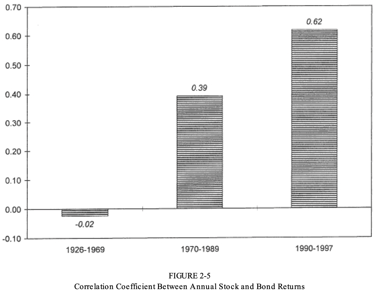 图4 这不仅明确了在长期权益投资的重要性,也告诉我们持有周期的长短对资管组合选择的重要性。很可惜,持有周期似乎从未作为变量出现在有关资产组合的金融理论中,这又要归因到害人不浅的随机行走假设了。这也间接导致了早些年持有周期的边缘地位以及股票债券差别不大的普遍认知。 这样看来,如果说对长期投资来说,债券还能有一线生机的话,那似乎就是成为权益投资的替代品,为投资者分担些许可能的风险。在这个前提下,如果股票与债券收益的统计学相关系数是负数,而且接近-1,那么债券就完全有理由加入长期投资者的资产组合大家庭中。 下面这张图将1926年至1997年分为了三个不等的年份组分别代表近代、现代与当代,统计了它们各自的股票债券的收益相关系数。 1926至1969年是-0.02,而到了1970往后系数不仅为正,而且似乎还有逐年递增的势头。债券的风险分担与下位替换作用已经开始变得越来越弱。