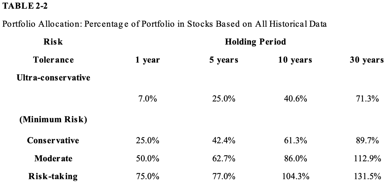 图3 当然,这并不能为前面短期权益市场吓人的上下限差距开脱。但从另一种角度看,权益资产的上限始终要高出固收资产一头,并且从5年长的持有周期开始,股票的历史最差年化收益就几乎平齐债权了,而从20年长的周期往后权益投资就变成了稳赚不赔的买卖。 更具体地说,持股周期从17年开始就已经能保证完全的实际正收益了,这个从未被打破、具有历史统计显著性的总结简直如同其他领域的神圣定理一般,将股票捧上了最安全长期投资的宝座。 这条“定理”很大程度上依赖于风险随持股周期变长而导致的指数性下降。人们曾一度认为在长期股票的风险是按照持股周期长短的平方根倍而降低的,也就是所谓的随机游走(Random Walk)假设。但通过历史数据计算就会发现,股票的风险降低速率要远快于这种假设,而它可怜的兄弟债券的风险变化速率反而要远小于这种假设,因此股票在长期中的稳定性会愈发有保障。(这也是股票均值回归特性的一种体现)如果好奇假设与实际的差距,在之前的风险水平柱状图中也标有黑色线段表示随机游走模型的期望标准差。 话虽如此,可这样一来似乎就在暗示,要将重心放在长期,且短期市场的变化也不应该影响理性长期权益投资者的决策。在市场巅峰期增仓,这种反人性的行为对长期投资者而言,真的是可行的吗? 从量级上考虑,股票市场长期的收益绝对会比短期波动收益要高得多,以30年持股周期为例,几乎能达到1:5的收益比,因此投资者也大可不必被眼前的利益所迷惑。还有一句废话,处在波动之中时谁又能完美预测短期市场高低点呢?如果真有这类奇人,那么他们大概更适合做短期高频,而不是耐着性子做长期。 长达十几二十年的规划周期对于一般的投资者来说,有些遥不可及的感觉,也因此没有受到部分投资人的重视。他们更愿意在相对短的周期交易持有资产,即使是做长期规划也可能只针对某几只股票或债券。但从收益的角度而言,投资者需要对其资产组合有较为整体的、从长计议的周期规划,而这也是越来越普遍的趋势所在。 对于长期规划,下面的这张资产组合配置比例表可以做简单参考。它表现了从上到下四种风险承受能力逐级提高的人群以及不同持有周期下投资者应该考虑的权益占总组合比例。 对最优解的分析表明,越愿意承担风险,越有耐心愿意等待的话,越可以尝试将权益比例放得更大。在长期,部分情况下权益投资的最优占比甚至超过了百分之百,告诉投资者不妨通过杠杆等手段扩大收益。