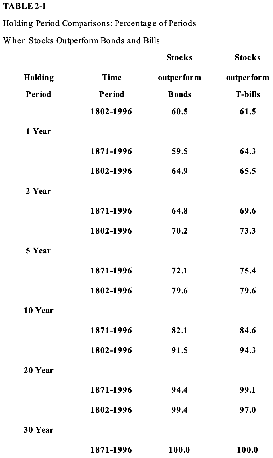 图2 可以看到,与固收投资的情况相比,权益投资收益的上下限差距与风险水平随着持股周期的增加而急剧降低。 虽然前面两张图都表明短期权益市场没有固收资产来得稳当,但其实它远没有看上去那么惊悚。下面这张图金融市场200年间不同持有周期下权益资产收益高于长短期债券收益的概率期望。第三四列分别对应长期与短期债券。 结果令人安心,权益投资从未陷入劣势局面。即使是短如一年的持有周期,权益与固收的胜负也是六四开,而更长期情况下逐级增长的优势也让股票更加值得选择。